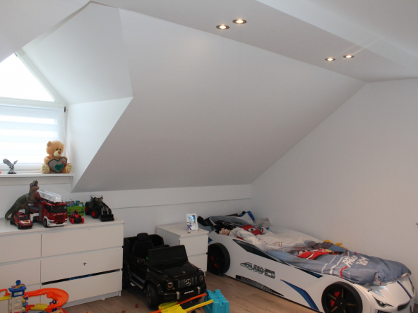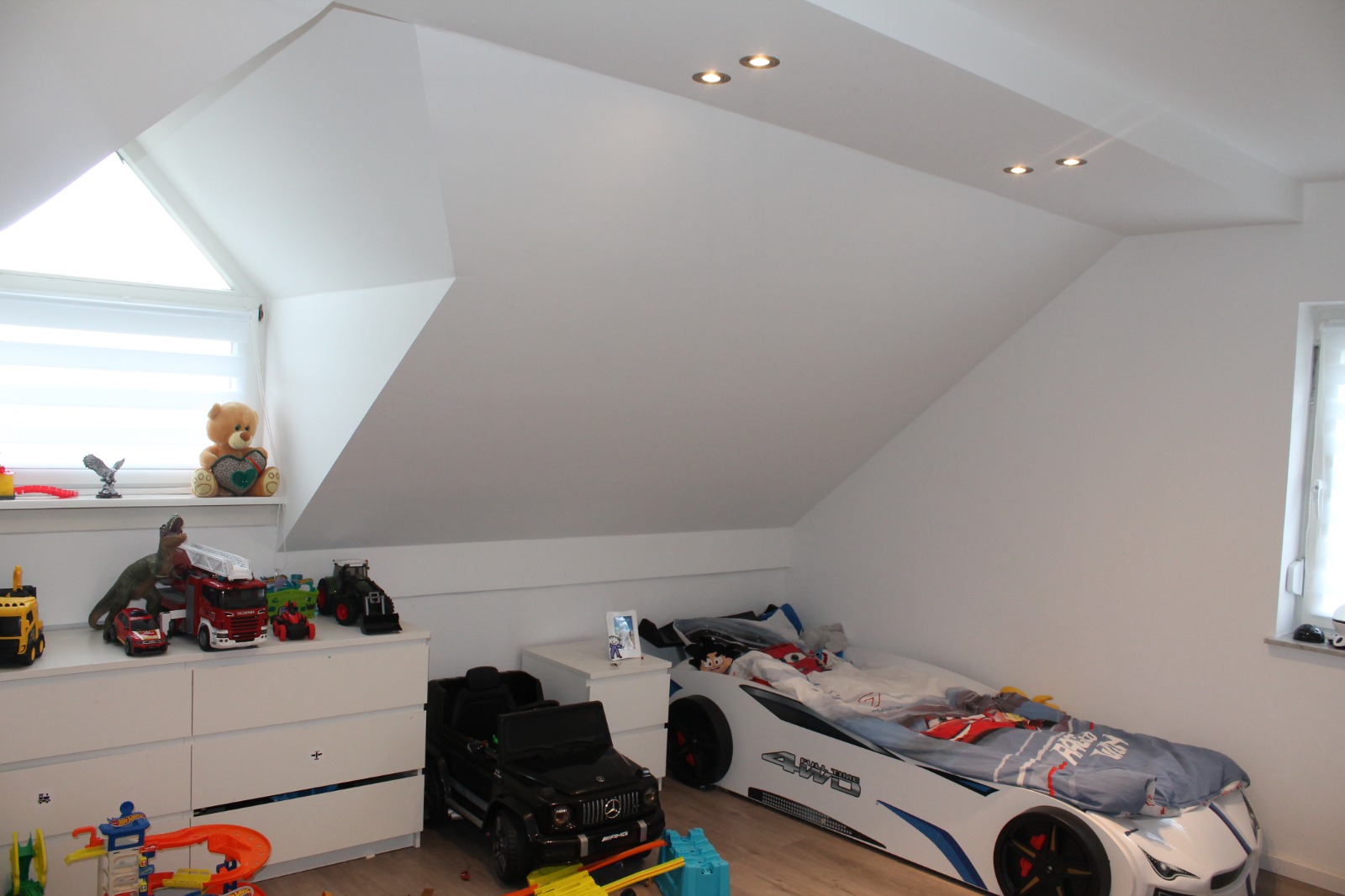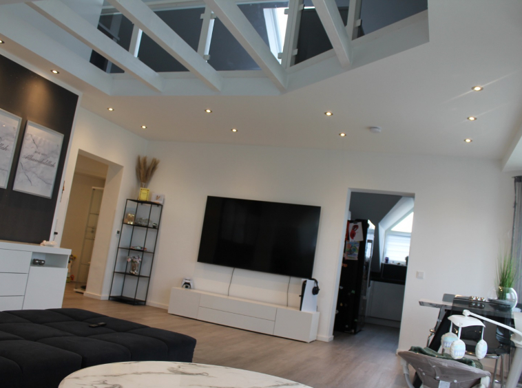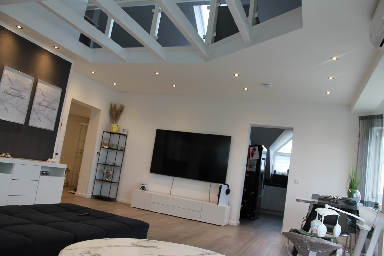 In jedem Zimmer erwartet Sie eine angenehme Atmosphäre dank der Malerfliestapete und der Spotbeleuchtung, die für eine stimmungsvolle Beleuchtung sorgt. Die Wände sind in strahlendem Weiß gehalten, was den Räumen ein helles und freundliches Ambiente verleiht.