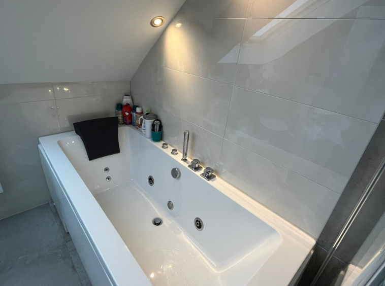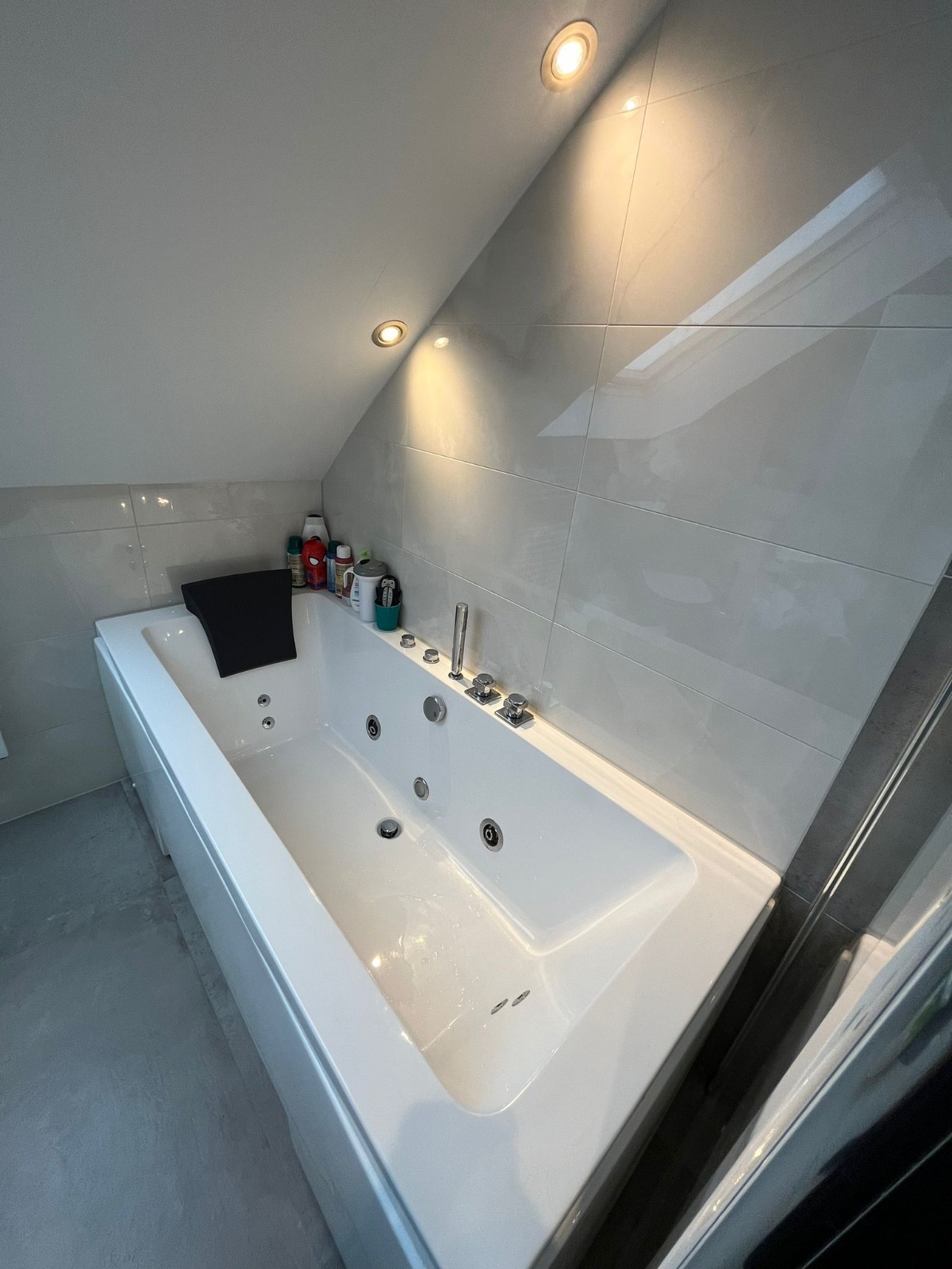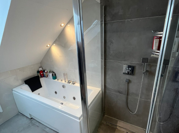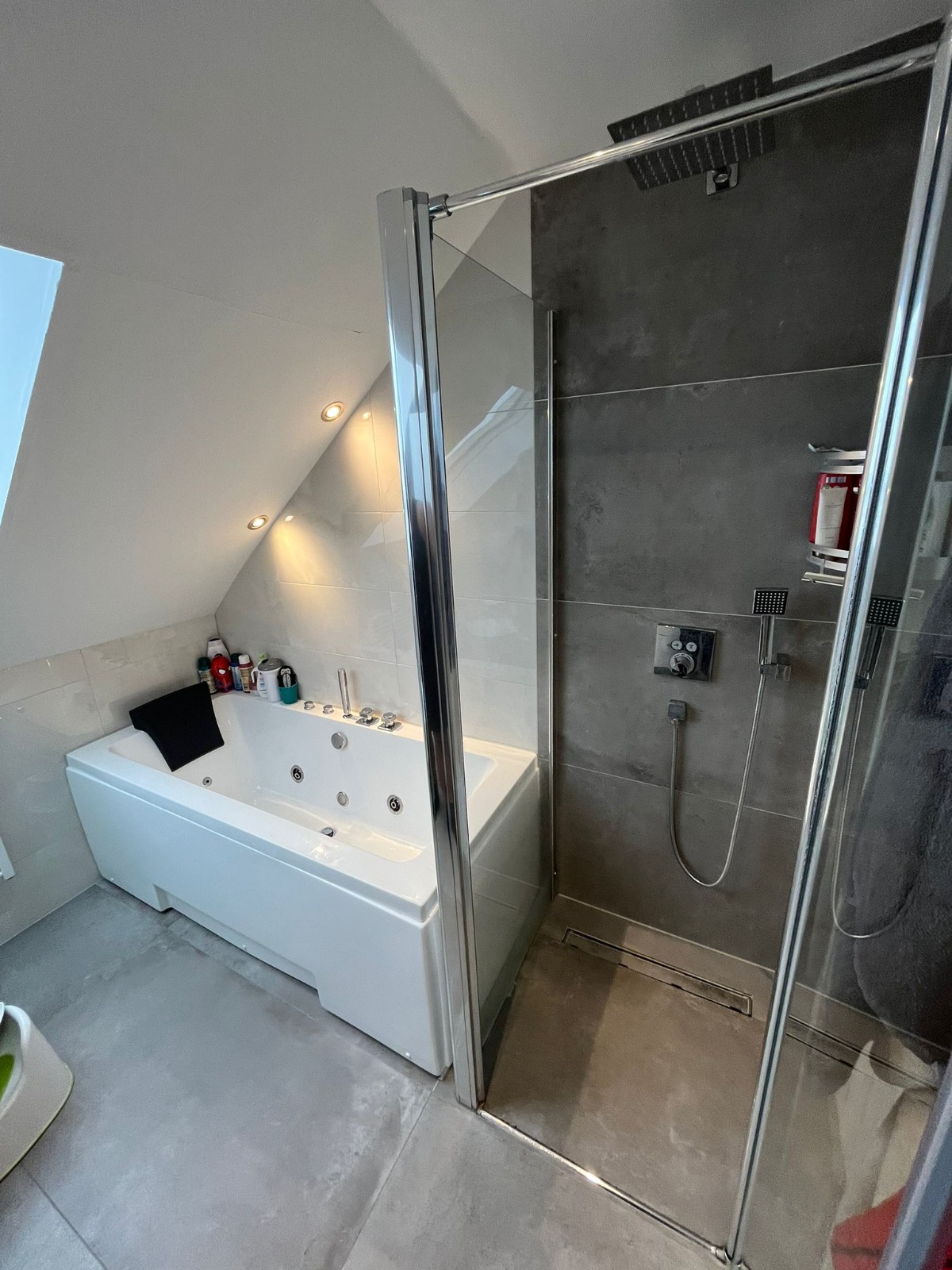 Das Badezimmer ist ein echtes Wellness-Paradies mit einer modernen Regendusche und einem entspannenden Whirlpool, wo Sie den Alltagsstress hinter sich lassen können. Die hochwertige Ausstattung und die geschmackvolle Gestaltungsorgen für ein Höchstmaß an Komfort und Wohlbefinden.